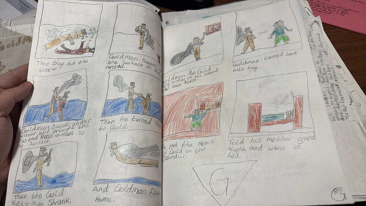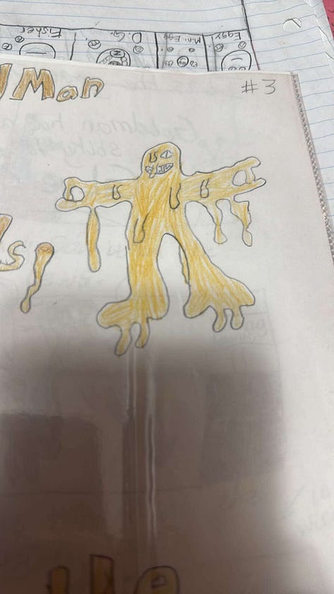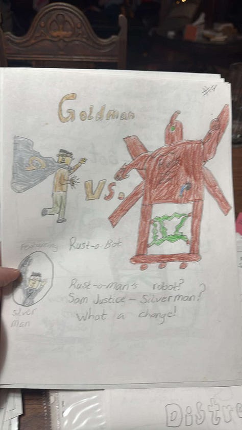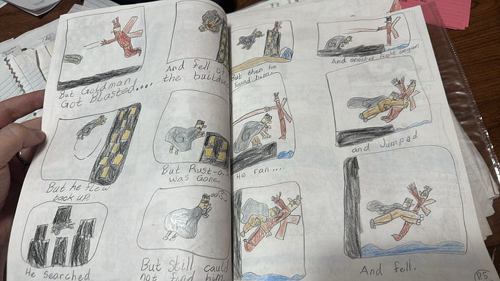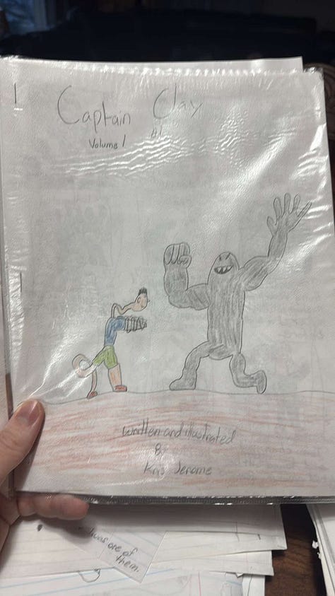 Our very own Kris Jerome was doing a connected comic universe while Scott was still in diapers (and Scott is older)! His super original characters included Goldman, Captain Clay, and Glue Guy! Check out why we can’t wait for Kris to illustrate his own book again in the future: